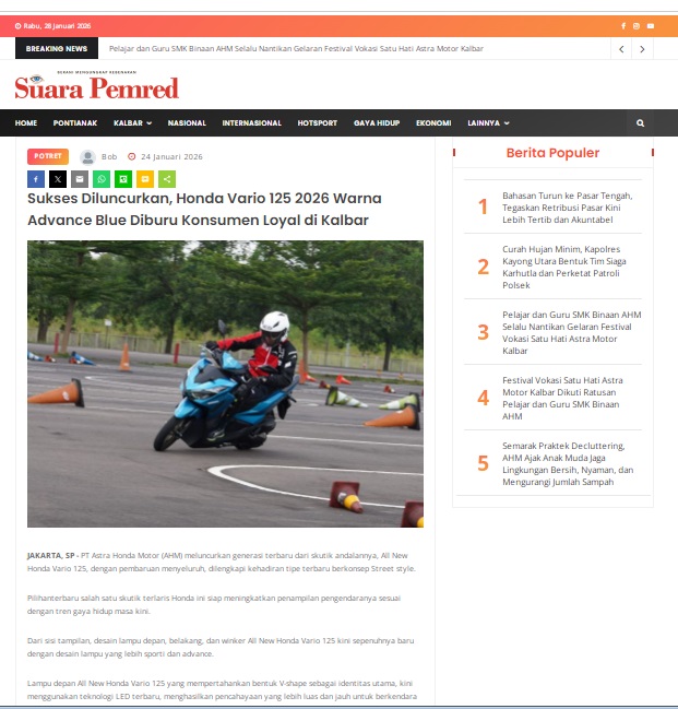 Sukses Diluncurkan, Honda Vario 125 2026 Warna Advance Blue Diburu Konsumen Loyal di Kalbar by masmul 24 Januari 2026 in Silahkan kunjungi https://www.suarapemredkalbar.com/read/potret/24012026/sukses-diluncurkan-honda-vario-125-2026-warna-advance-blue-diburu-konsumen-loyal-di-kalbar. You Might Like Regional Public Launching New ADV160 The SUV Pride Grand Launching New PCX 160 Truly Exceptional! Tetap hati-hati ya bro sist berkendara saat hujan.