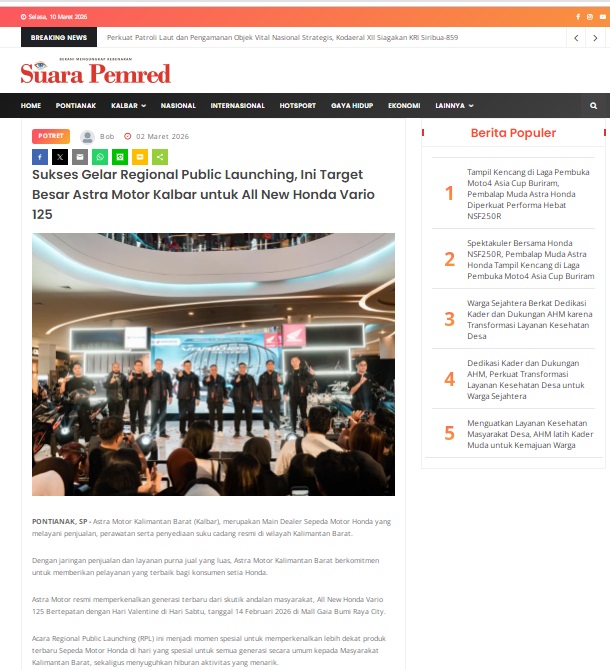 Sukses Gelar Regional Public Launching, Ini Target Besar Astra Motor Kalbar untuk All New Honda Vario 125 by masmul 2 Maret 2026 in Silahkan kunjungi https://www.suarapemredkalbar.com/read/potret/02032026/sukses-gelar-regional-public-launching-ini-target-besar-astra-motor-kalbar-untuk-all-new-honda-vario-125. You Might Like Regional Public Launching New ADV160 The SUV Pride Grand Launching New PCX 160 Truly Exceptional! Tetap hati-hati ya bro sist berkendara saat hujan.