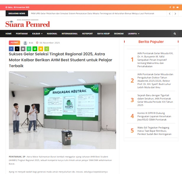 Sukses Gelar Seleksi Tingkat Regional 2025, Astra Motor Kalbar Berikan AHM Best Student untuk Pelajar Terbaik by masmul 6 November 2025 in Silahkan kunjungi https://www.suarapemredkalbar.com/read/potret/06112025/sukses-gelar-seleksi-tingkat-regional-2025-astra-motor-kalbar-berikan-ahm-best-student-untuk-pelajar-terbaik. You Might Like Regional Public Launching New ADV160 The SUV Pride Grand Launching New PCX 160 Truly Exceptional! Tetap hati-hati ya bro sist berkendara saat hujan.