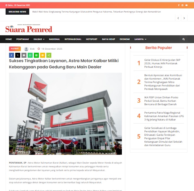 Sukses Tingkatkan Layanan, Astra Motor Kalbar Miliki Kebanggaan pada Gedung Baru Main Dealer by masmul 18 Desember 2025 in Silahkan kunjungi https://www.suarapemredkalbar.com/read/potret/18122025/sukses-tingkatkan-layanan-astra-motor-kalbar-miliki-kebanggaan-pada-gedung-baru-main-dealer. You Might Like Regional Public Launching New ADV160 The SUV Pride Grand Launching New PCX 160 Truly Exceptional! Tetap hati-hati ya bro sist berkendara saat hujan.