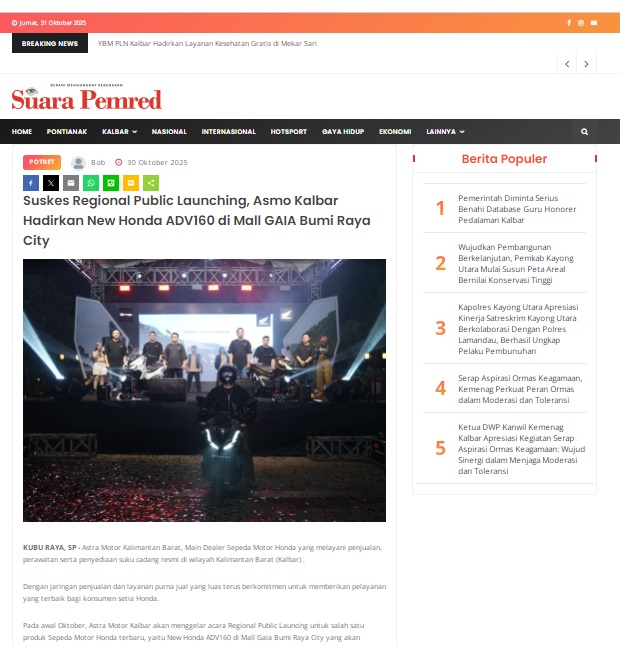 Suskes Regional Public Launching, Asmo Kalbar Hadirkan New Honda ADV160 di Mall GAIA Bumi Raya City by masmul 30 Oktober 2025 in Silahkan kunjungi https://www.suarapemredkalbar.com/read/potret/30102025/suskes-regional-public-launching-asmo-kalbar-hadirkan-new-honda-adv160-di-mall-gaia-bumi-raya-city. You Might Like Regional Public Launching New ADV160 The SUV Pride Grand Launching New PCX 160 Truly Exceptional! Tetap hati-hati ya bro sist berkendara saat hujan.