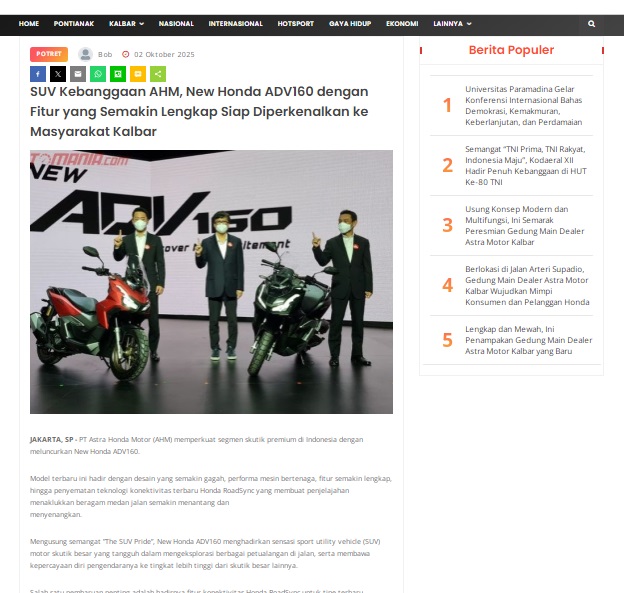 SUV Kebanggaan AHM, New Honda ADV160 dengan Fitur yang Semakin Lengkap Siap Diperkenalkan ke Masyarakat Kalbar by masmul 2 Oktober 2025 in Silahkan kunjungi https://www.suarapemredkalbar.com/read/potret/02102025/suv-kebanggaan-ahm-new-honda-adv160-dengan-fitur-yang-semakin-lengkapsiap-diperkenalkan-ke-masyarakat-kalbar. You Might Like Regional Public Launching New ADV160 The SUV Pride Grand Launching New PCX 160 Truly Exceptional! Tetap hati-hati ya bro sist berkendara saat hujan.