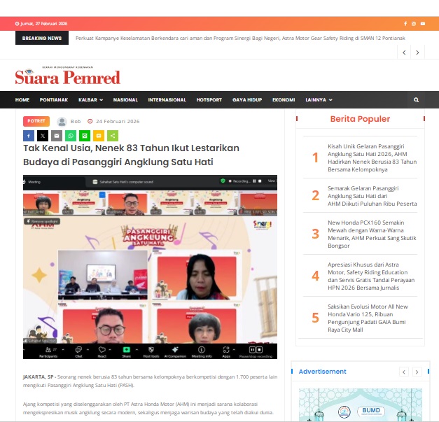 Tak Kenal Usia, Nenek 83 Tahun Ikut Lestarikan Budaya di Pasanggiri Angklung Satu Hati by masmul 24 Februari 2026 in Silahkan kunjungi https://www.suarapemredkalbar.com/read/potret/24022026/tak-kenal-usia-nenek-83-tahun-ikut-lestarikan-budaya-di-pasanggiri-angklung-satu-hati. You Might Like Regional Public Launching New ADV160 The SUV Pride Grand Launching New PCX 160 Truly Exceptional! Tetap hati-hati ya bro sist berkendara saat hujan.