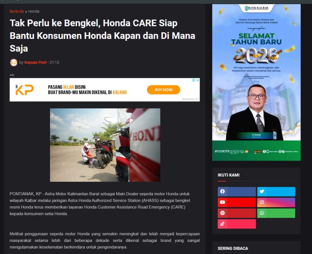 Tak Perlu ke Bengkel, Honda CARE Siap Bantu Konsumen Honda Kapan dan Di Mana Saja by Muhammad Arif 1 Januari 2026 in Silahkan kunjungi https://www.kapuaspost.web.id/2026/01/tak-perlu-ke-bengkel-honda-care-siap.html. Tags: astra Astra Motor kalbar Astra Motor Pontianak astramotor honda kalbar pontianak sepeda motor You Might Like Regional Public Launching New ADV160 The SUV Pride Grand Launching New PCX 160 Truly Exceptional! Tetap hati-hati ya bro sist berkendara saat hujan.