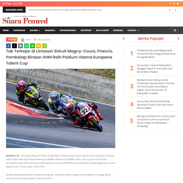 Tak Terkejar di Lintasan Sirkuit Magny-Cours, Prancis, Pembalap Binaan AHM Raih Podium Utama Europena Talent Cup by masmul 8 Juli 2025 in Silahkan kunjungi https://www.suarapemredkalbar.com/read/potret/08072025/tak-terkejar-di-lintasan-sirkuit-magny-cours-prancis-pembalap-binaan-ahm-raih-podium-utama-europena-talent-cup. You Might Like Regional Public Launching New ADV160 The SUV Pride Grand Launching New PCX 160 Truly Exceptional! Tetap hati-hati ya bro sist berkendara saat hujan.