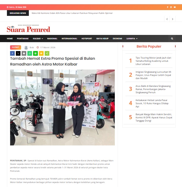 Tambah Hemat Extra Promo Spesial di Bulan Ramadhan oleh Astra Motor Kalbar by masmul 17 Maret 2026 in Silahkan kunjungi https://www.suarapemredkalbar.com/read/potret/17032026/tambah-hemat-extra-promo-spesial-di-bulan-ramadhan-oleh-astra-motor-kalbar. You Might Like Regional Public Launching New ADV160 The SUV Pride Grand Launching New PCX 160 Truly Exceptional! Tetap hati-hati ya bro sist berkendara saat hujan.