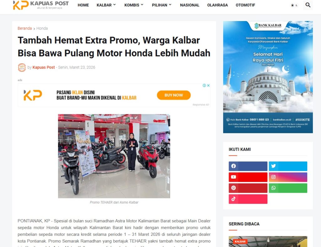 Tambah Hemat Extra Promo, Warga Kalbar Bisa Bawa Pulang Motor Honda Lebih Mudah by Muhammad Arif 23 Maret 2026 in Silahkan kunjungi https://www.kapuaspost.web.id/2026/03/tambah-hemat-extra-promo-warga-kalbar.html. Tags: astra Astra Motor kalbar Astra Motor Pontianak astramotor honda kalbar pontianak sepeda motor You Might Like Regional Public Launching New ADV160 The SUV Pride Grand Launching New PCX 160 Truly Exceptional! Tetap hati-hati ya bro sist berkendara saat hujan.