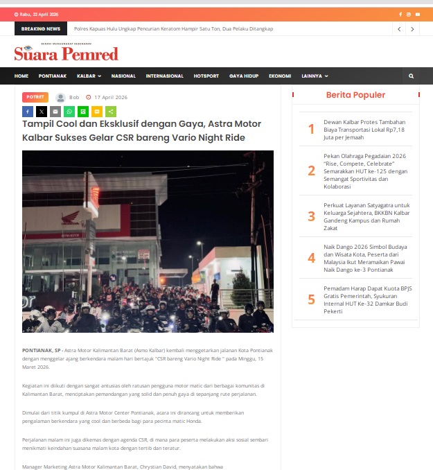 Tampil Cool dan Eksklusif dengan Gaya, Astra Motor Kalbar Sukses Gelar CSR bareng Vario Night Ride by masmul 17 April 2026 in Silahkan kunjungi https://www.suarapemredkalbar.com/read/potret/17042026/tampil-cool-dan-eksklusif-dengan-gaya-astra-motor-kalbar-sukses-gelar-csr-bareng-vario-night-ride. You Might Like Regional Public Launching New ADV160 The SUV Pride Grand Launching New PCX 160 Truly Exceptional! Tetap hati-hati ya bro sist berkendara saat hujan.