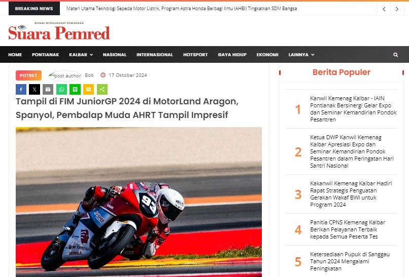 Tampil di FIM JuniorGP 2024 di MotorLand Aragon, Spanyol, Pembalap Muda AHRT Tampil Impresif by masmul 17 Oktober 2024 in Silahkan kunjungi https://www.suarapemredkalbar.com/read/potret/17102024/tampil-di-fim-juniorgp-2024-di-motorland-aragon-spanyol-pembalap-muda-ahrt-tampil-impresif. You Might Like Regional Public Launching New ADV160 The SUV Pride Grand Launching New PCX 160 Truly Exceptional! Tetap hati-hati ya bro sist berkendara saat hujan.
