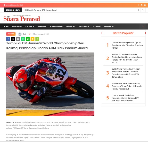 Tampil di FIM JuniorGP World Championship Seri Kelima, Pembalap Binaan AHM Bidik Podium Juara by masmul 19 September 2025 in Silahkan kunjungi https://www.suarapemredkalbar.com/read/potret/19092025/tampil-di-fim-juniorgp-world-championship-seri-kelima-pembalap-binaan-ahm-bidik-podium-juara. You Might Like Regional Public Launching New ADV160 The SUV Pride Grand Launching New PCX 160 Truly Exceptional! Tetap hati-hati ya bro sist berkendara saat hujan.