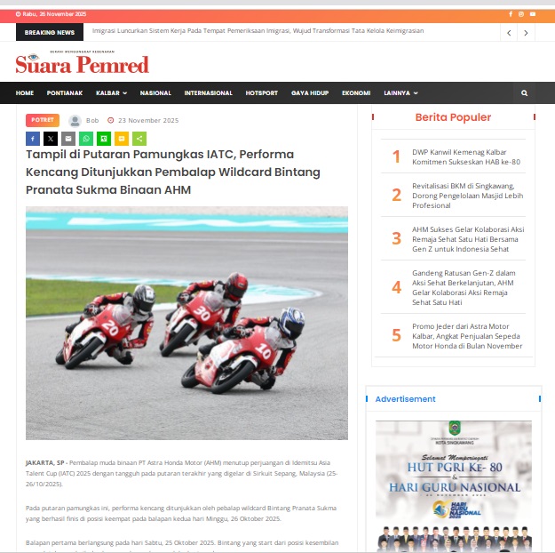 Tampil di Putaran Pamungkas IATC, Performa Kencang Ditunjukkan Pembalap Wildcard Bintang Pranata Sukma Binaan AHM by masmul 23 November 2025 in Silahkan kunjungi https://www.suarapemredkalbar.com/read/potret/23112025/tampil-di-putaran-pamungkas-iatc-performa-kencang-ditunjukkan-pembalap-wildcard-bintang-pranata-sukma-binaan-ahm. You Might Like Regional Public Launching New ADV160 The SUV Pride Grand Launching New PCX 160 Truly Exceptional! Tetap hati-hati ya bro sist berkendara saat hujan.
