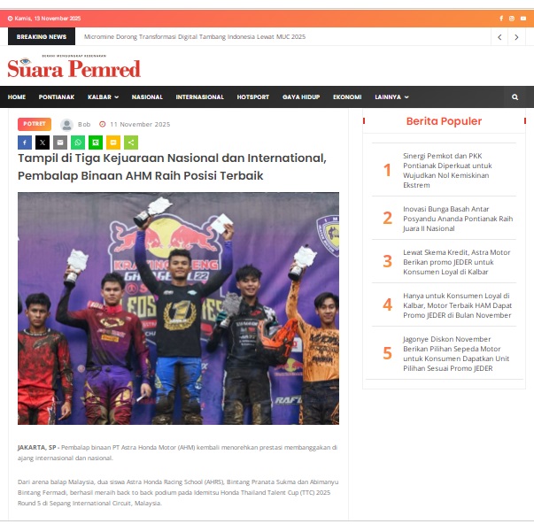 Tampil di Tiga Kejuaraan Nasional dan International, Pembalap Binaan AHM Raih Posisi Terbaik by masmul 11 November 2025 in Silahkan kunjungi https://www.suarapemredkalbar.com/read/potret/11112025/tampil-di-tiga-kejuaraan-nasional-dan-international-pembalap-binaan-ahm-raih-posisi-terbaik. You Might Like Regional Public Launching New ADV160 The SUV Pride Grand Launching New PCX 160 Truly Exceptional! Tetap hati-hati ya bro sist berkendara saat hujan.