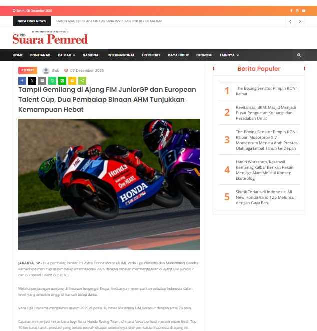 Tampil Gemilang di Ajang FIM JuniorGP dan European Talent Cup, Dua Pembalap Binaan AHM Tunjukkan Kemampuan Hebat by masmul 7 Desember 2025 in Silahkan kunjungi https://www.suarapemredkalbar.com/read/potret/07122025/tampil-gemilang-di-ajang-fim-juniorgp-dan-european-talent-cup-dua-pembalap-binaan-ahm-tunjukkan-kemampuan-hebat. You Might Like Regional Public Launching New ADV160 The SUV Pride Grand Launching New PCX 160 Truly Exceptional! Tetap hati-hati ya bro sist berkendara saat hujan.