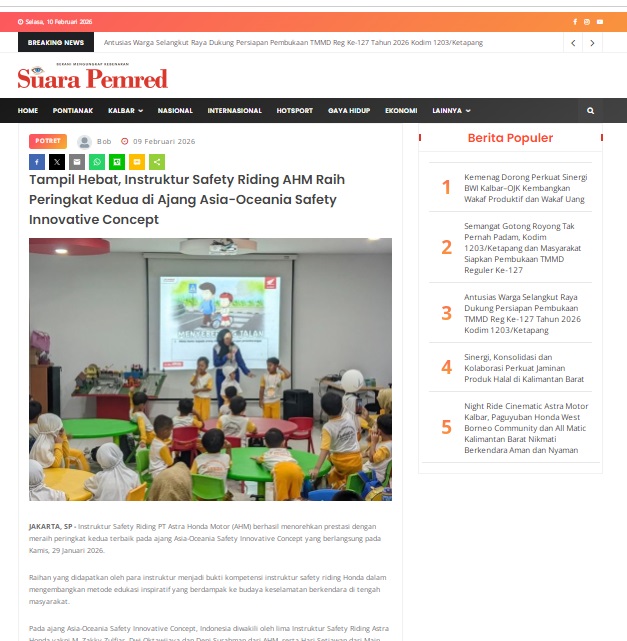 Tampil Hebat, Instruktur Safety Riding AHM Raih Peringkat Kedua di Ajang Asia-Oceania Safety Innovative Concept by masmul 9 Februari 2026 in Silahkan kunjungi https://www.suarapemredkalbar.com/read/potret/09022026/tampil-hebat-instruktur-safety-riding-ahm-raih-peringkat-kedua-di-ajang-asia-oceania-safety-innovative-concept. You Might Like Regional Public Launching New ADV160 The SUV Pride Grand Launching New PCX 160 Truly Exceptional! Tetap hati-hati ya bro sist berkendara saat hujan.