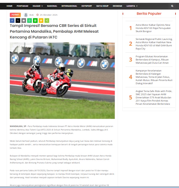 Tampil Impresif Bersama CBR Series di Sirkuit Pertamina Mandalika, Pembalap AHM Melesat Kencang di Putaran IATC by masmul 25 Oktober 2025 in Silahkan kunjungi https://www.suarapemredkalbar.com/read/potret/25102025/tampil-impresif-bersama-cbr-series-di-sirkuit-pertamina-mandalika-pembalap-ahm-melesat-kencang-di-putaran-iatc. You Might Like Regional Public Launching New ADV160 The SUV Pride Grand Launching New PCX 160 Truly Exceptional! Tetap hati-hati ya bro sist berkendara saat hujan.