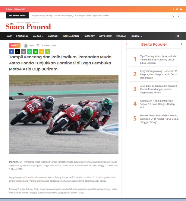 Tampil Kencang dan Raih Podium, Pembalap Muda Astra Honda Tunjukkan Dominasi di Laga Pembuka Moto4 Asia Cup Buriram by masmul 15 Maret 2026 in Silahkan kunjungi https://www.suarapemredkalbar.com/read/potret/15032026/tampil-kencang-dan-raih-podium-pembalap-muda-astra-honda-tunjukkan-dominasi-di-laga-pembuka-moto4-asia-cup-buriram. You Might Like Regional Public Launching New ADV160 The SUV Pride Grand Launching New PCX 160 Truly Exceptional! Tetap hati-hati ya bro sist berkendara saat hujan.