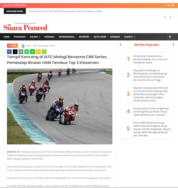 Tampil Kencang di IATC Motegi Bersama CBR Series, Pembalap Binaan HAM Tembus Top 3 Klasemen by masmul 30 Oktober 2025 in Silahkan kunjungi https://www.suarapemredkalbar.com/read/potret/30102025/tampil-kencang-di-iatc-motegi-bersama-cbr-series-pembalap-binaan-ham-tembus-top-3-klasemen. You Might Like Regional Public Launching New ADV160 The SUV Pride Grand Launching New PCX 160 Truly Exceptional! Tetap hati-hati ya bro sist berkendara saat hujan.