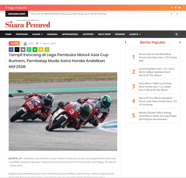 Tampil Kencang di Laga Pembuka Moto4 Asia Cup Buriram, Pembalap Muda Astra Honda Andalkan NSF250R by masmul 11 Maret 2026 in Silahkan kunjungi https://www.suarapemredkalbar.com/read/potret/11032026/tampil-kencang-di-laga-pembuka-moto4-asia-cup-buriram-pembalap-muda-astra-honda-andalkan-nsf250r. You Might Like Regional Public Launching New ADV160 The SUV Pride Grand Launching New PCX 160 Truly Exceptional! Tetap hati-hati ya bro sist berkendara saat hujan.