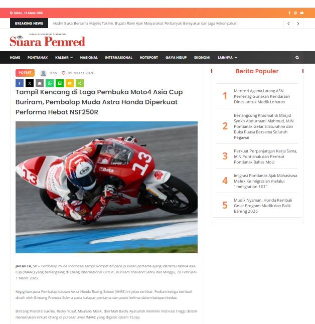 Tampil Kencang di Laga Pembuka Moto4 Asia Cup Buriram, Pembalap Muda Astra Honda Diperkuat Performa Hebat NSF250R by masmul 9 Maret 2026 in Silahkan kunjungi https://www.suarapemredkalbar.com/read/potret/09032026/tampil-kencang-di-laga-pembuka-moto4-asia-cup-buriram-pembalap-muda-astra-honda-diperkuat-performa-hebat-nsf250r. You Might Like Regional Public Launching New ADV160 The SUV Pride Grand Launching New PCX 160 Truly Exceptional! Tetap hati-hati ya bro sist berkendara saat hujan.