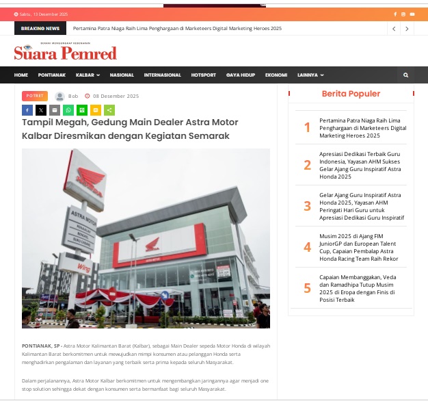 Tampil Megah, Gedung Main Dealer Astra Motor Kalbar Diresmikan dengan Kegiatan Semarak by masmul 8 Desember 2025 in Silahkan kunjungi https://www.suarapemredkalbar.com/read/potret/08122025/tampil-megah-gedung-main-dealer-astra-motor-kalbar-diresmikan-dengan-kegiatan-semarak. You Might Like Regional Public Launching New ADV160 The SUV Pride Grand Launching New PCX 160 Truly Exceptional! Tetap hati-hati ya bro sist berkendara saat hujan.
