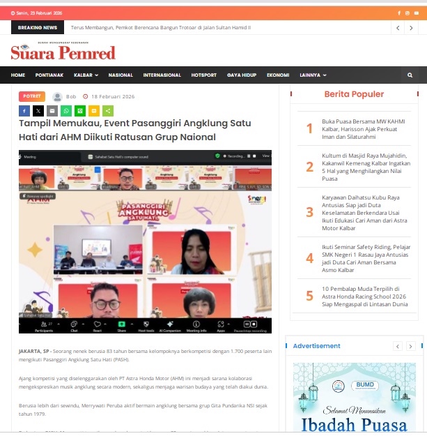 Tampil Memukau, Event Pasanggiri Angklung Satu Hati dari AHM Diikuti Ratusan Grup Nasional by masmul 18 Februari 2026 in Silahkan kunjungi https://www.suarapemredkalbar.com/read/potret/18022026/tampil-memukau-event-pasanggiri-angklung-satu-hati-dari-ahm-diikuti-ratusan-grup-naional. You Might Like Regional Public Launching New ADV160 The SUV Pride Grand Launching New PCX 160 Truly Exceptional! Tetap hati-hati ya bro sist berkendara saat hujan.