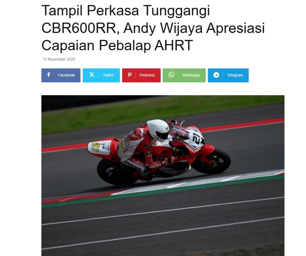 Tampil Perkasa Tunggangi CBR600RR, Andy Wijaya Apresiasi Capaian Pebalap AHRT by Nova Sari 11 November 2025 in Silahkan kunjungi https://equator.co.id/tampil-perkasa-tunggangi-cbr600rr-andy-wijaya-apresiasi-capaian-pebalap-ahrt/. You Might Like Regional Public Launching New ADV160 The SUV Pride Grand Launching New PCX 160 Truly Exceptional! Tetap hati-hati ya bro sist berkendara saat hujan.