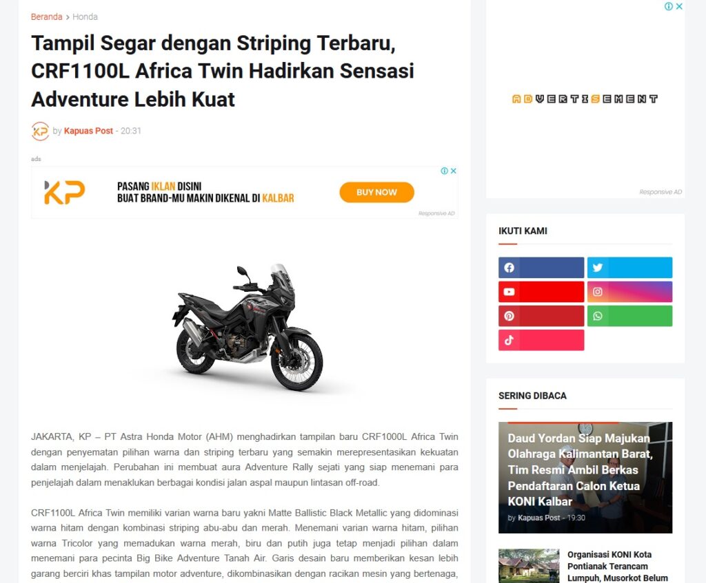 Tampil Segar dengan Striping Terbaru, CRF1100L Africa Twin Hadirkan Sensasi Adventure Lebih Kuat by Muhammad Arif 25 November 2025 in Silahkan kunjungi https://www.kapuaspost.web.id/2025/11/tampil-segar-dengan-striping-terbaru.html. Tags: astra Astra Motor kalbar Astra Motor Pontianak astramotor honda kalbar pontianak sepeda motor You Might Like Regional Public Launching New ADV160 The SUV Pride Grand Launching New PCX 160 Truly Exceptional! Tetap hati-hati ya bro sist berkendara saat hujan.