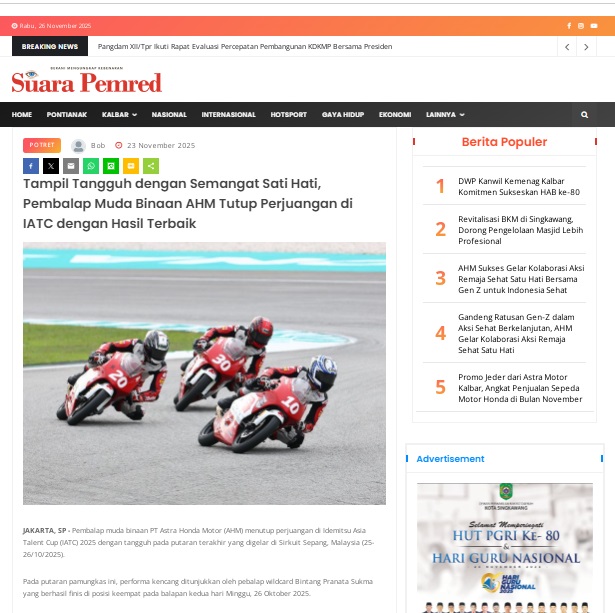 Tampil Tangguh dengan Semangat Sati Hati, Pembalap Muda Binaan AHM Tutup Perjuangan di IATC dengan Hasil Terbaik by masmul 23 November 2025 in Silahkan kunjungi https://www.suarapemredkalbar.com/read/potret/23112025/tampil-tangguh-dengan-semangat-sati-hati-pembalap-muda-binaan-ahm-tutup-perjuangan-di-iatc-dengan-hasil-terbaik. You Might Like Regional Public Launching New ADV160 The SUV Pride Grand Launching New PCX 160 Truly Exceptional! Tetap hati-hati ya bro sist berkendara saat hujan.