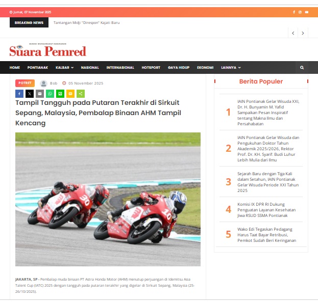 Tampil Tangguh pada Putaran Terakhir di Sirkuit Sepang, Malaysia, Pembalap Binaan AHM Tampil Kencang by masmul 5 November 2025 in Silahkan kunjungi https://www.suarapemredkalbar.com/read/potret/05112025/tampil-tangguh-pada-putaran-terakhir-di-sirkuit-sepang-malaysia-pembalap-binaan-ahm-tampil-kencang. You Might Like Regional Public Launching New ADV160 The SUV Pride Grand Launching New PCX 160 Truly Exceptional! Tetap hati-hati ya bro sist berkendara saat hujan.