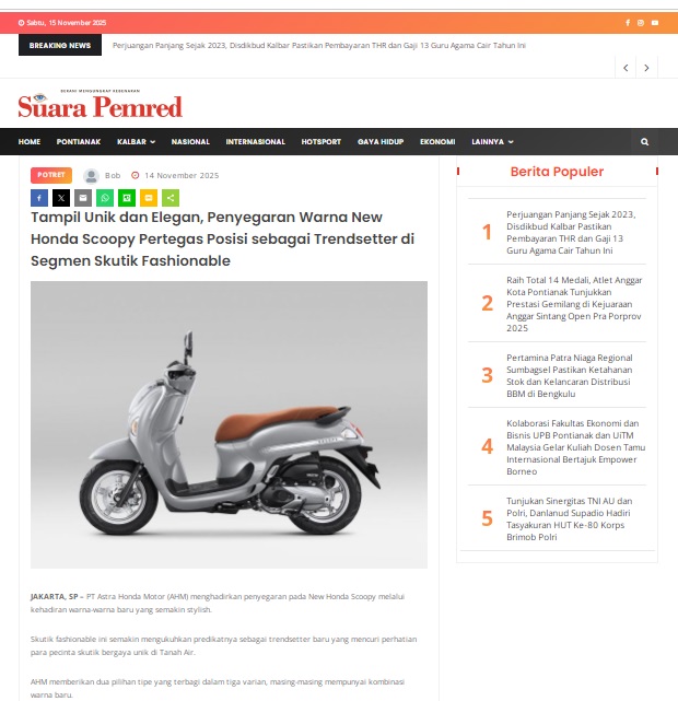 Tampil Unik dan Elegan, Penyegaran Warna New Honda Scoopy Pertegas Posisi sebagai Trendsetter di Segmen Skutik Fashionable by masmul 14 November 2025 in Silahkan kunjungi https://www.suarapemredkalbar.com/read/potret/14112025/tampil-unik-dan-elegan-penyegaran-warna-new-honda-scoopy-pertegas-posisi-sebagai-trendsetter-di-segmen-skutik-fashionable. You Might Like Regional Public Launching New ADV160 The SUV Pride Grand Launching New PCX 160 Truly Exceptional! Tetap hati-hati ya bro sist berkendara saat hujan.
