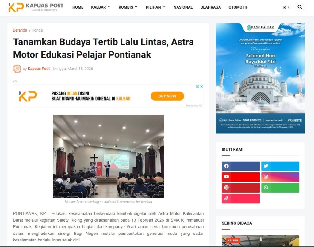 Tanamkan Budaya Tertib Lalu Lintas, Astra Motor Edukasi Pelajar Pontianak by Muhammad Arif 15 Maret 2026 in Silahkan kunjungi https://www.kapuaspost.web.id/2026/03/tanamkan-budaya-tertib-lalu-lintas.html. Tags: astra Astra Motor kalbar Astra Motor Pontianak astramotor honda kalbar pontianak sepeda motor You Might Like Regional Public Launching New ADV160 The SUV Pride Grand Launching New PCX 160 Truly Exceptional! Tetap hati-hati ya bro sist berkendara saat hujan.