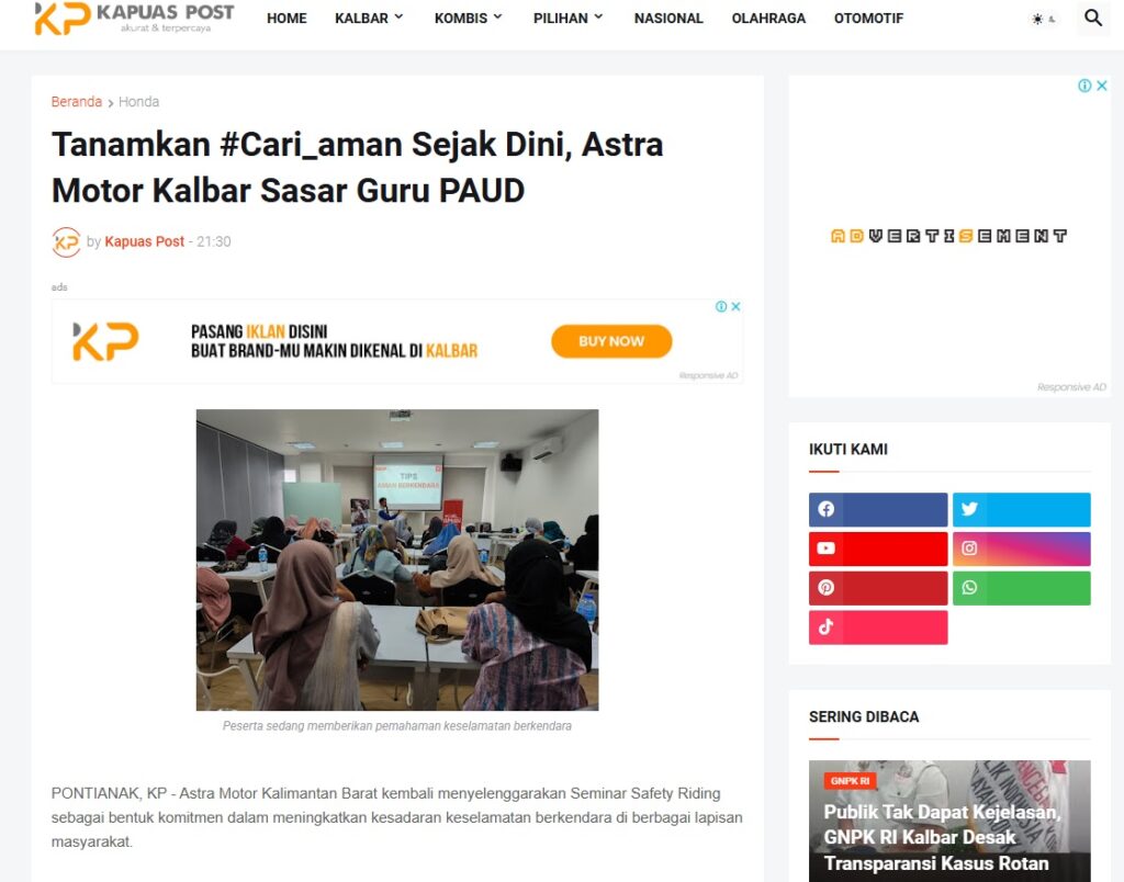 Tanamkan #Cari_aman Sejak Dini, Astra Motor Kalbar Sasar Guru PAUD by Muhammad Arif 29 Januari 2026 in Silahkan kunjungi https://www.kapuaspost.web.id/2026/01/tanamkan-cariaman-sejak-dini-astra.html. Tags: astra Astra Motor kalbar Astra Motor Pontianak astramotor honda kalbar pontianak sepeda motor You Might Like Regional Public Launching New ADV160 The SUV Pride Grand Launching New PCX 160 Truly Exceptional! Tetap hati-hati ya bro sist berkendara saat hujan.
