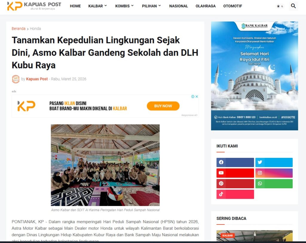 Tanamkan Kepedulian Lingkungan Sejak Dini, Asmo Kalbar Gandeng Sekolah dan DLH Kubu Raya by Muhammad Arif 25 Maret 2026 in Silahkan kunjungi https://www.kapuaspost.web.id/2026/03/tanamkan-kepedulian-lingkungan-sejak.html. Tags: astra Astra Motor kalbar Astra Motor Pontianak astramotor honda kalbar pontianak sepeda motor You Might Like Regional Public Launching New ADV160 The SUV Pride Grand Launching New PCX 160 Truly Exceptional! Tetap hati-hati ya bro sist berkendara saat hujan.
