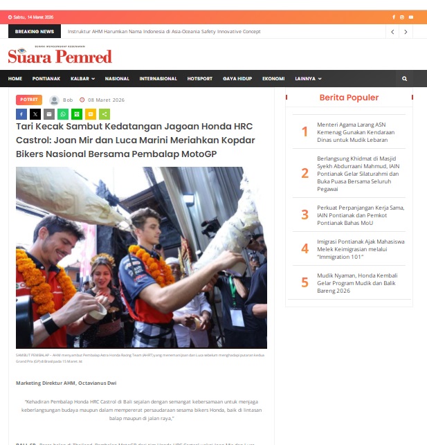 Tari Kecak Sambut Kedatangan Jagoan Honda HRC Castrol: Joan Mir dan Luca Marini Meriahkan Kopdar Bikers Nasional Bersama Pembalap MotoGP by masmul 8 Maret 2026 in Silahkan kunjungi https://www.suarapemredkalbar.com/read/potret/08032026/tari-kecak-sambut-kedatangan-jagoan-honda-hrc-castrol-joan-mir-dan-luca-marini-meriahkan-kopdar-bikers-nasional-bersama-pembalap-motogp. You Might Like Regional Public Launching New ADV160 The SUV Pride Grand Launching New PCX 160 Truly Exceptional! Tetap hati-hati ya bro sist berkendara saat hujan.