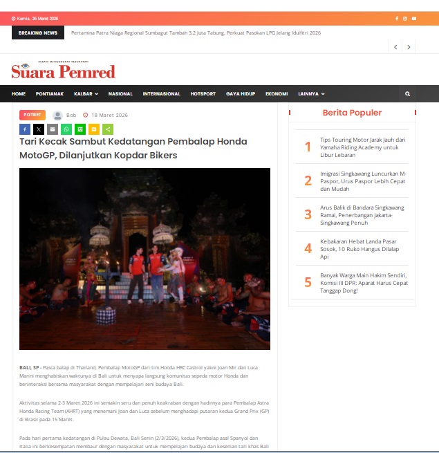 Tari Kecak Sambut Kedatangan Pembalap Honda MotoGP, Dilanjutkan Kopdar Bikers by masmul 18 Maret 2026 in Silahkan kunjungi https://www.suarapemredkalbar.com/read/potret/18032026/tari-kecak-sambut-kedatangan-pembalap-honda-motogp-dilanjutkan-kopdar-bikers-1. You Might Like Regional Public Launching New ADV160 The SUV Pride Grand Launching New PCX 160 Truly Exceptional! Tetap hati-hati ya bro sist berkendara saat hujan.