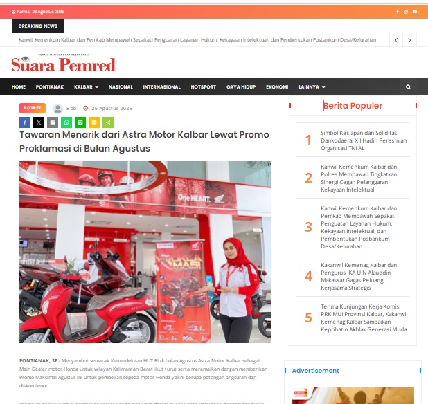 Tawaran Menarik dari Astra Motor Kalbar Lewat Promo Proklamasi di Bulan Agustus by masmul 25 Agustus 2025 in Silahkan kunjungi https://www.suarapemredkalbar.com/read/potret/25082025/tawaran-menarik-dari-astra-motor-kalbar-lewat-promo-proklamasi-di-bulan-agustus. You Might Like Regional Public Launching New ADV160 The SUV Pride Grand Launching New PCX 160 Truly Exceptional! Tetap hati-hati ya bro sist berkendara saat hujan.