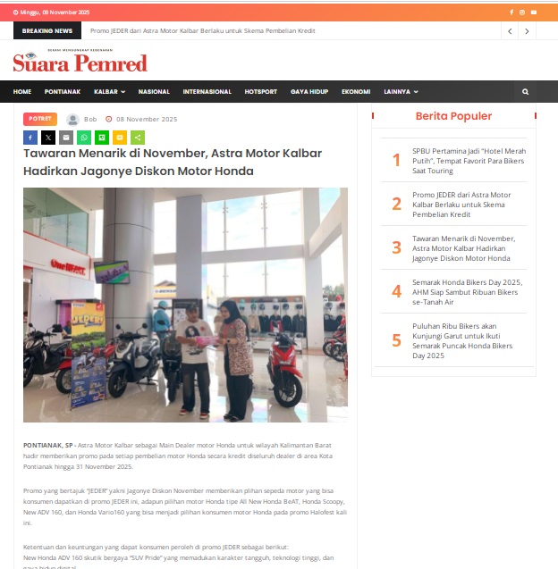 Tawaran Menarik di November, Astra Motor Kalbar Hadirkan Jagonye Diskon Motor Honda by masmul 8 November 2025 in Silahkan kunjungi https://www.suarapemredkalbar.com/read/potret/08112025/tawaran-menarik-di-november-astra-motor-kalbar-hadirkan-jagonye-diskon-motor-honda. You Might Like Regional Public Launching New ADV160 The SUV Pride Grand Launching New PCX 160 Truly Exceptional! Tetap hati-hati ya bro sist berkendara saat hujan.