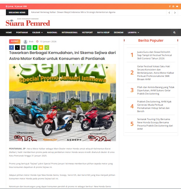 Tawarkan Berbagai Kemudahan, Ini Skema Sejiwa dari Astra Motor Kalbar untuk Konsumen di Pontianak by masmul 13 Januari 2026 in Silahkan kunjungi https://www.suarapemredkalbar.com/read/potret/13012026/tawarkan-berbagai-kemudahan-ini-skema-sejiwa-dari-astra-motor-kalbar-untuk-konsumen-di-pontianak. You Might Like Regional Public Launching New ADV160 The SUV Pride Grand Launching New PCX 160 Truly Exceptional! Tetap hati-hati ya bro sist berkendara saat hujan.