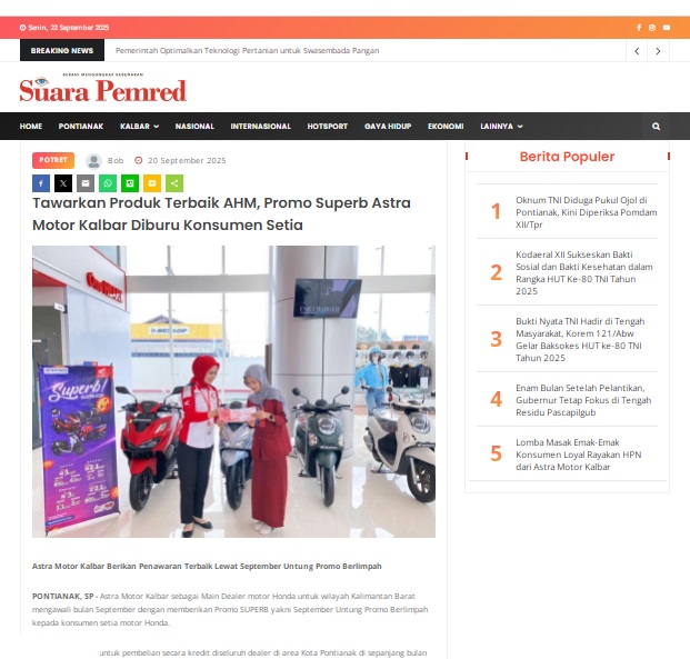 Tawarkan Produk Terbaik AHM, Promo Superb Astra Motor Kalbar Diburu Konsumen Setia by masmul 20 September 2025 in Silahkan kunjungi https://www.suarapemredkalbar.com/read/potret/20092025/tawarkan-produk-terbaik-ahm-promo-superb-astra-motor-kalbar-diburu-konsumen-setia. You Might Like Regional Public Launching New ADV160 The SUV Pride Grand Launching New PCX 160 Truly Exceptional! Tetap hati-hati ya bro sist berkendara saat hujan.