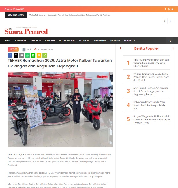 TEHAER Ramadhan 2026, Astra Motor Kalbar Tawarkan DP Ringan dan Angsuran Terjangkau by masmul 17 Maret 2026 in Silahkan kunjungi https://www.suarapemredkalbar.com/read/potret/17032026/tehaer-ramadhan-2026-astra-motor-kalbar-tawarkan-dp-ringan-dan-angsuran-terjangkau. You Might Like Regional Public Launching New ADV160 The SUV Pride Grand Launching New PCX 160 Truly Exceptional! Tetap hati-hati ya bro sist berkendara saat hujan.