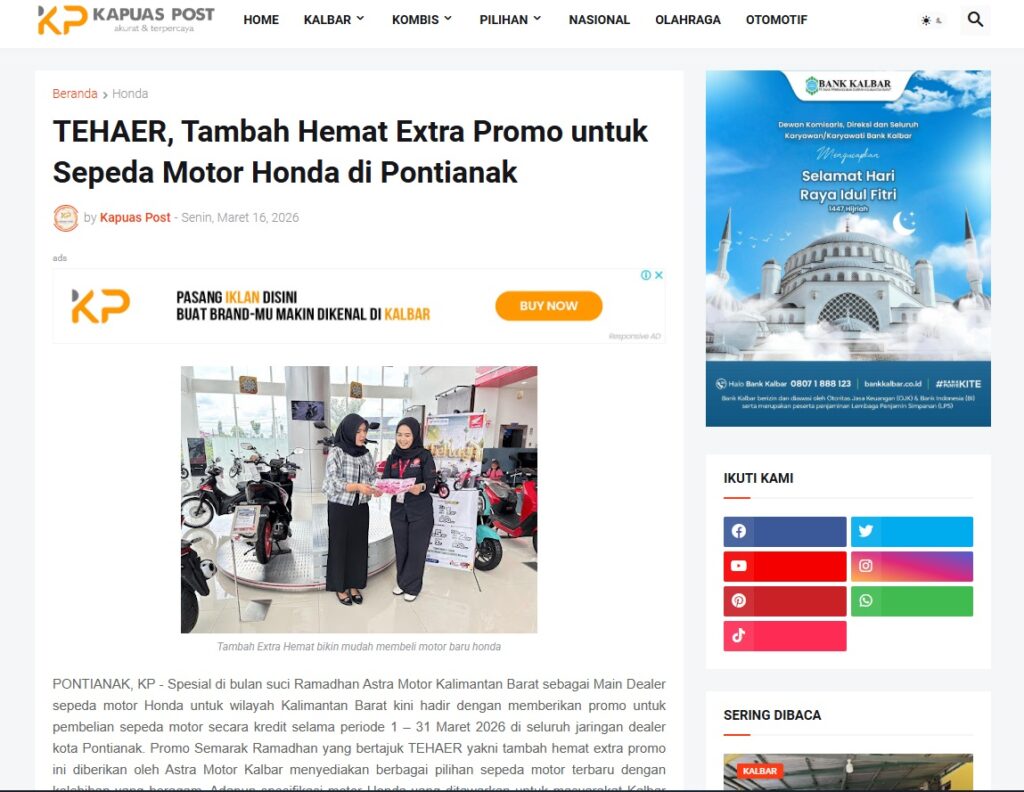 TEHAER, Tambah Hemat Extra Promo untuk Sepeda Motor Honda di Pontianak by Muhammad Arif 16 Maret 2026 in Silahkan kunjungi https://www.kapuaspost.web.id/2026/03/tehaer-tambah-hemat-extra-promo-untuk.html. Tags: astra Astra Motor kalbar Astra Motor Pontianak astramotor honda kalbar pontianak sepeda motor You Might Like Regional Public Launching New ADV160 The SUV Pride Grand Launching New PCX 160 Truly Exceptional! Tetap hati-hati ya bro sist berkendara saat hujan.