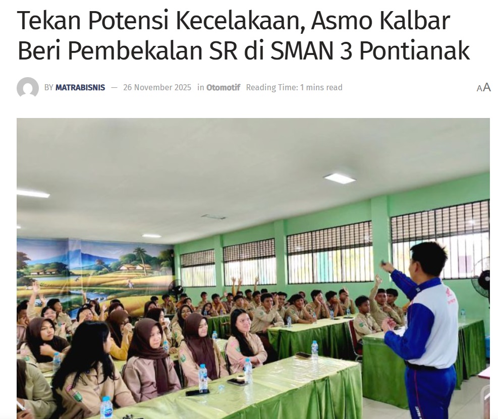 Tekan Potensi Kecelakaan, Asmo Kalbar Beri Pembekalan SR di SMAN 3 Pontianak by Sri Yuliantiningsih 26 November 2025 in Silahkan kunjungi https://matrabisnis.id/2025/11/26/tekan-potensi-kecelakaan-asmo-kalbar-beri-pembekalan-sr-di-sman-3-pontianak/. You Might Like Regional Public Launching New ADV160 The SUV Pride Grand Launching New PCX 160 Truly Exceptional! Tetap hati-hati ya bro sist berkendara saat hujan.