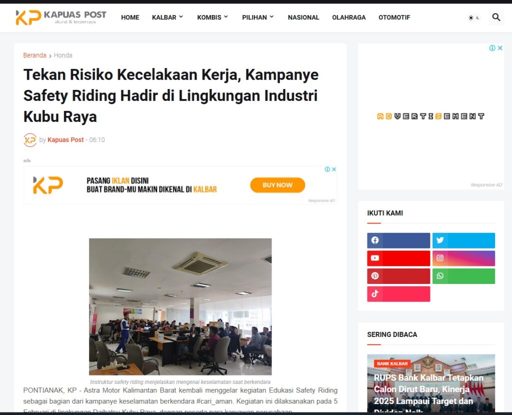 Tekan Risiko Kecelakaan Kerja, Kampanye Safety Riding Hadir di Lingkungan Industri Kubu Raya by Muhammad Arif 27 Februari 2026 in Silahkan kunjungi https://www.kapuaspost.web.id/2026/02/tekan-risiko-kecelakaan-kerja-kampanye.html. Tags: astra Astra Motor kalbar Astra Motor Pontianak astramotor honda kalbar pontianak sepeda motor You Might Like Regional Public Launching New ADV160 The SUV Pride Grand Launching New PCX 160 Truly Exceptional! Tetap hati-hati ya bro sist berkendara saat hujan.