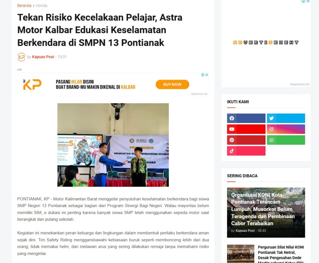 Tekan Risiko Kecelakaan Pelajar, Astra Motor Kalbar Edukasi Keselamatan Berkendara di SMPN 13 Pontianak by Muhammad Arif 11 Desember 2025 in Silahkan kunjungi https://www.kapuaspost.web.id/2025/12/tekan-risiko-kecelakaan-pelajar-astra.html. Tags: astra Astra Motor kalbar Astra Motor Pontianak astramotor honda kalbar pontianak sepeda motor You Might Like Regional Public Launching New ADV160 The SUV Pride Grand Launching New PCX 160 Truly Exceptional! Tetap hati-hati ya bro sist berkendara saat hujan.