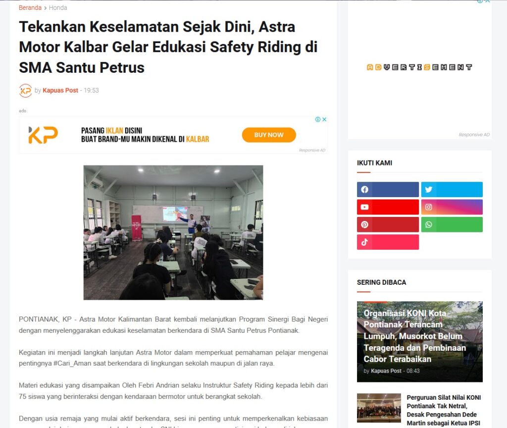 Tekankan Keselamatan Sejak Dini, Astra Motor Kalbar Gelar Edukasi Safety Riding di SMA Santu Petrus by Muhammad Arif 13 Desember 2025 in Silahkan kunjungi https://www.kapuaspost.web.id/2025/12/tekankan-keselamatan-sejak-dini-astra.html. Tags: astra Astra Motor kalbar Astra Motor Pontianak astramotor honda kalbar pontianak sepeda motor You Might Like Regional Public Launching New ADV160 The SUV Pride Grand Launching New PCX 160 Truly Exceptional! Tetap hati-hati ya bro sist berkendara saat hujan.