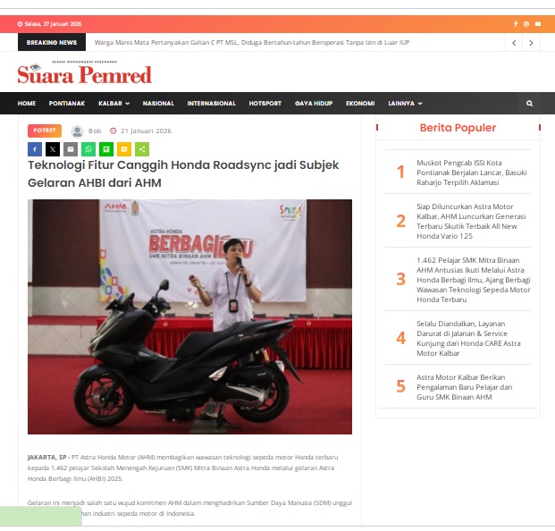 Teknologi Fitur Canggih Honda Roadsync jadi Subjek Gelaran AHBI dari AHM by masmul 21 Januari 2026 in Silahkan kunjungi https://www.suarapemredkalbar.com/read/potret/21012026/teknologi-fitur-canggih-honda-roadsync-jadi-subjek-gelaran-ahbi-dari-ahm. You Might Like Regional Public Launching New ADV160 The SUV Pride Grand Launching New PCX 160 Truly Exceptional! Tetap hati-hati ya bro sist berkendara saat hujan.