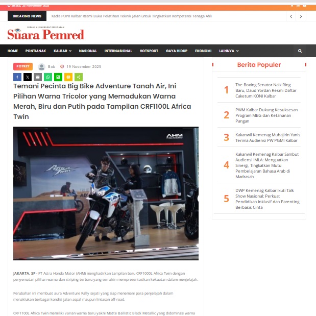 Temani Pecinta Big Bike Adventure Tanah Air, Ini Pilihan Warna Tricolor yang Memadukan Warna Merah, Biru dan Putih pada Tampilan CRF1100L Africa Twin by masmul 19 November 2025 in Silahkan kunjungi https://www.suarapemredkalbar.com/read/potret/19112025/temani-pecinta-big-bike-adventure-tanah-air-ini-pilihan-warna-tricolor-yang-memadukan-warna-merah-biru-dan-putih-pada-tampilan-crf1100l-africa-twin. You Might Like Regional Public Launching New ADV160 The SUV Pride Grand Launching New PCX 160 Truly Exceptional! Tetap hati-hati ya bro sist berkendara saat hujan.