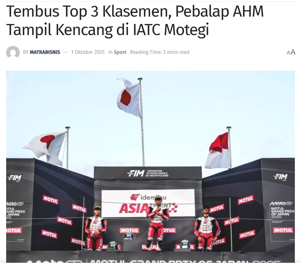 Tembus Top 3 Klasemen, Pebalap AHM Tampil Kencang di IATC Motegi by Sri Yuliantiningsih 1 Oktober 2025 in Silahkan kunjungi https://matrabisnis.id/2025/10/01/tembus-top-3-klasemen-pebalap-ahm-tampil-kencang-di-iatc-motegi/. You Might Like Regional Public Launching New ADV160 The SUV Pride Grand Launching New PCX 160 Truly Exceptional! Tetap hati-hati ya bro sist berkendara saat hujan.