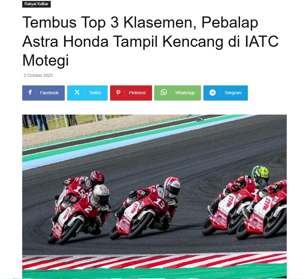 Tembus Top 3 Klasemen, Pebalap Astra Honda Tampil Kencang di IATC Motegi by Nova Sari 2 Oktober 2025 in Silahkan kunjungi https://equator.co.id/tembus-top-3-klasemen-pebalap-astra-honda-tampil-kencang-di-iatc-motegi/. You Might Like Regional Public Launching New ADV160 The SUV Pride Grand Launching New PCX 160 Truly Exceptional! Tetap hati-hati ya bro sist berkendara saat hujan.