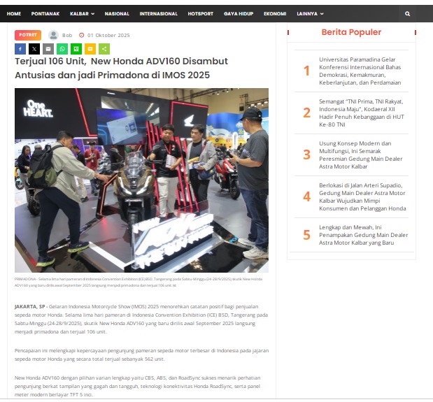 Terjual 106 Unit, New Honda ADV160 Disambut Antusias dan jadi Primadona di IMOS 2025 by masmul 1 Oktober 2025 in Silahkan kunjungi https://www.suarapemredkalbar.com/read/potret/01102025/terjual-106-unit-new-honda-adv160-disambut-antusias-dan-jadi-primadona-di-imos-2025. You Might Like Regional Public Launching New ADV160 The SUV Pride Grand Launching New PCX 160 Truly Exceptional! Tetap hati-hati ya bro sist berkendara saat hujan.